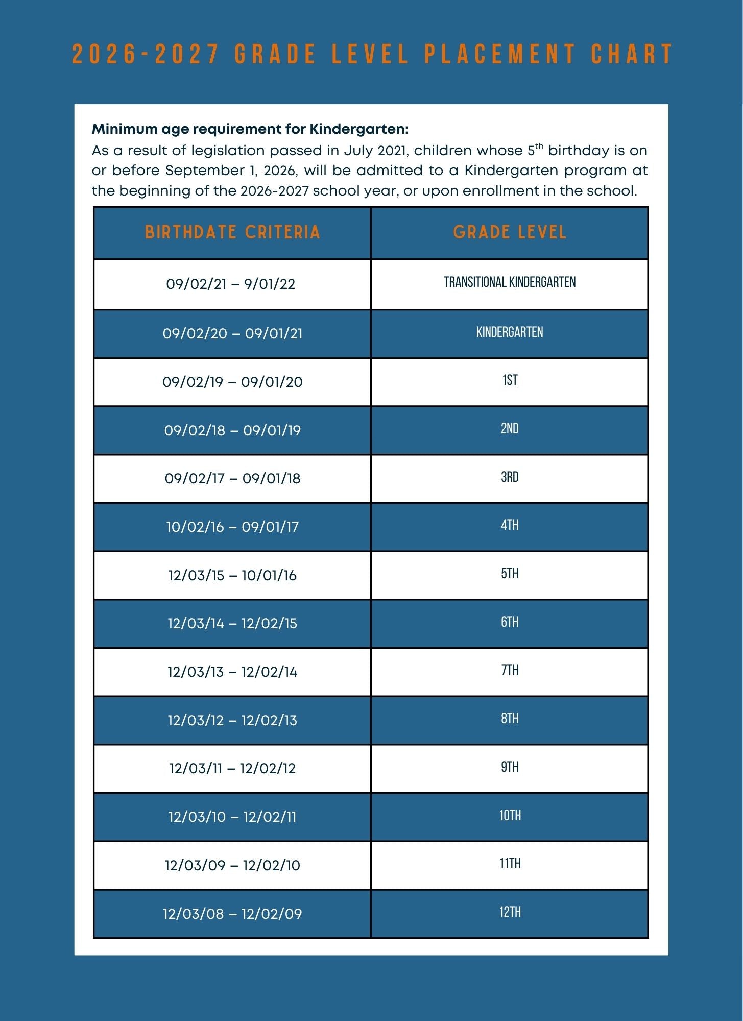 Monarch River Academy does not offer preschool programs at this time. In California, children are eligible for Transitional Kindergarten if they turn 4 years old by September 1st, 2025. Admittance into our Kindergarten program requires a student to turn 5 by September 1st, 2025 for the 2025-2026 school year. The Grade Level Placement chart can be located on our school websites under the Enrollment tab.